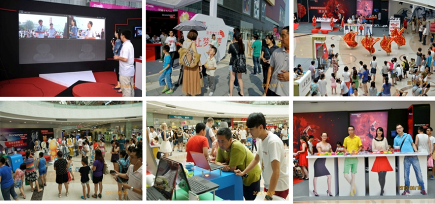 Shoppingmall萬達廣場暑促活動 全程策劃+執行 (聯想助力中國好聲音)讓夢發聲&S850愛出色推廣活動——青島、濟南雙城互動:通過大屏幕完成兩邊主持人和觀眾的游戲互動。